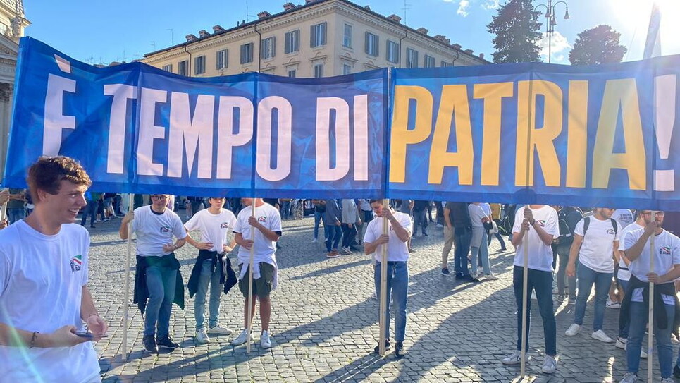 Ci sono più bandiere della gioventù nazionale, i giovani di FdI, che di Lega e Fi messi insieme. I giovani sono tanti, più di quello che uno potesse aspettarsi.