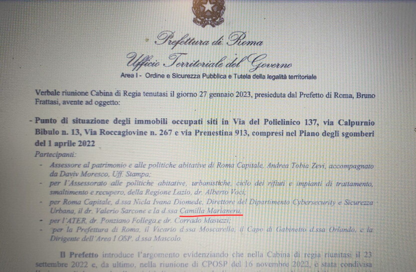 Da quanto risulta dai documenti in possesso del Foglio, la giovane aspirante avvocato (assunta dal Comune con un contratto da 48mila euro all'anno), lo scorso 27 gennaio andò in Prefettura per Roma Capitale per fare il punto sulla situazione degli immobili occupati. In particolare, come si legge nel verbale di Palazzo Valentini, per i casi di via del Policlinico 137, via Calpurnio Bibulo 13, via Roccagiovine 267 e via Prenestina 913. Quattro casi inseriti nel piano sgomberi. Su alcuni di questi c'è il racket della malavita romana.