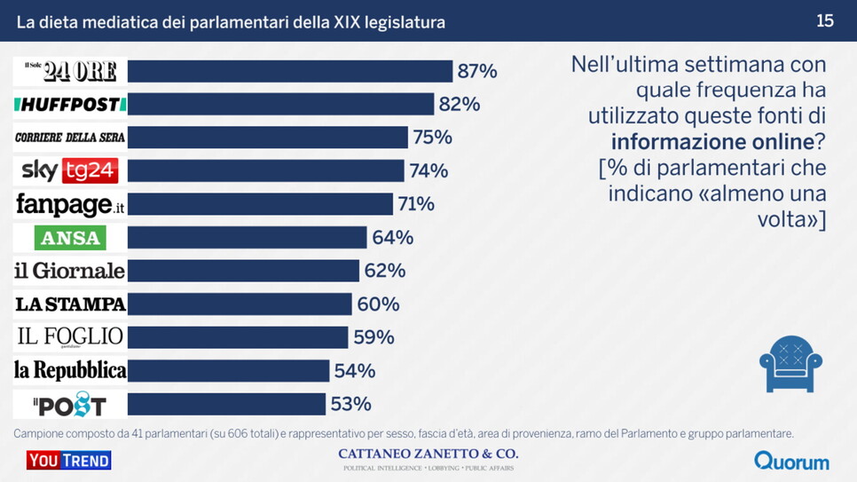 Tra i quotidiani online, la principale fonte d'informazione è il sito del Sole 24 Ore (consultato dall'87 per cento dei parlamentari), subito dopo ci sono Huffington Post (82 per cento) e Corriere della Sera (75 per cento). La versione online del Foglio è consultata dal 59 per cento degli eletti (il 79 per cento di maggioranza, il 30 per cento di opposizione), stando al campione.