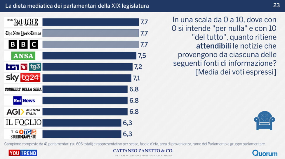 Secondo una rilevazione Quorum/YouTrend, tra deputati e senatori vanno forti le reti Rai. Ci si informa molto sui social e il nostro giornale ha il terzo miglior punteggio in quanto ad attendibilità