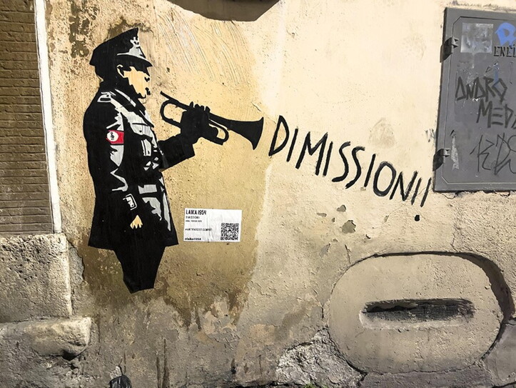 I cronisti bramano qualcuno che superi un po’ la retorica polemica. E finalmente arriva. Si chiama Angelo Nazio , classe 1925, già gappista. E’ in forma smagliante. “Guardate io non sono un estremista – dice – so che allora ognuno aveva le sue ragioni, il mio migliore amico nel 44’ si arruolò e finì repubblichino, io invece divenni partigiano, fu più il caso che altro a dividerci. E però dire che un battaglione di nazisti è una banda di musicisti è veramente spudorato, soprattutto se lo fai da seconda carica dello Stato, vieni al bar piuttosto”. La spudoratezza di La Russa poco più in là l’ha riassunta bene la street artist Laika. Un soldato nazista ha un grande megafono nella mano sinistra da quale esce la scritta DIMISSIONI. Sulla fascia che avvolge il braccio destro al posto della svastica ecco una bella chiave di violino.