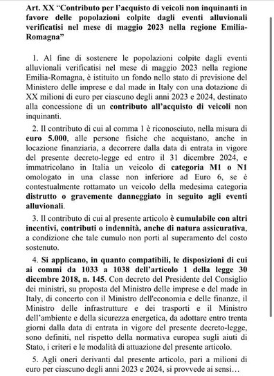 All'articolo XX del decreto, infatti, si prevede di istituire un fondo presso il ministero delle Imprese e del Made in Italy, al fine di "sostenere le popolazioni colpite dagli eventi alluvionali verificatisi nel mese maggio 2023 nella regione Emilia-Romagna". Il bonus, come detto, sarà di 5mila euro, e riguarda veicoli di categoria M1 o N1, in una classe non inferiore a Euro6. Nel testo si specifica che il contributo è cumulabile con altri incentivi e indennità "anche di natura assicurativa, a condizione che tale cumulo non porti al superamento del costo sostenuto".