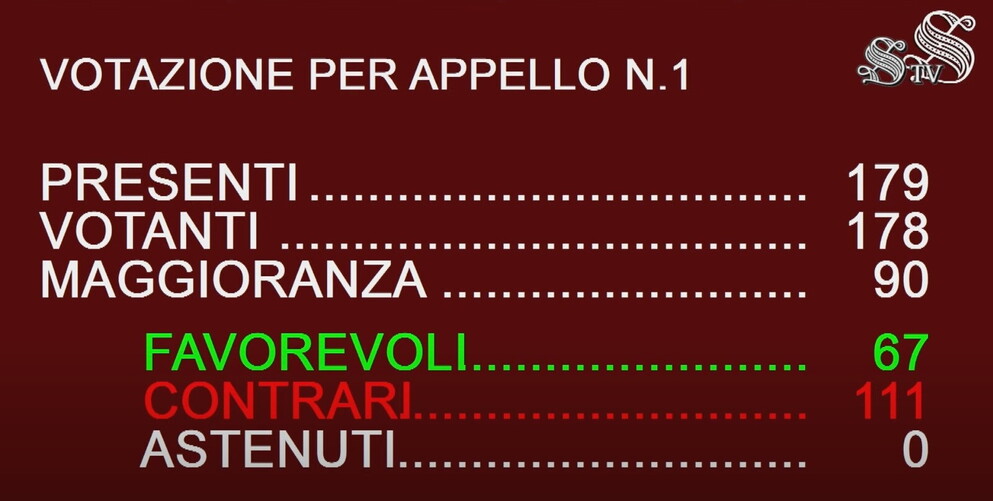 111 voti contrari, 67 quelli a favore da parte di M5s, che ha presentato la richiesta, Pd e Sinistra italiana-Verdi. Il Terzo polo esce dall'Aula