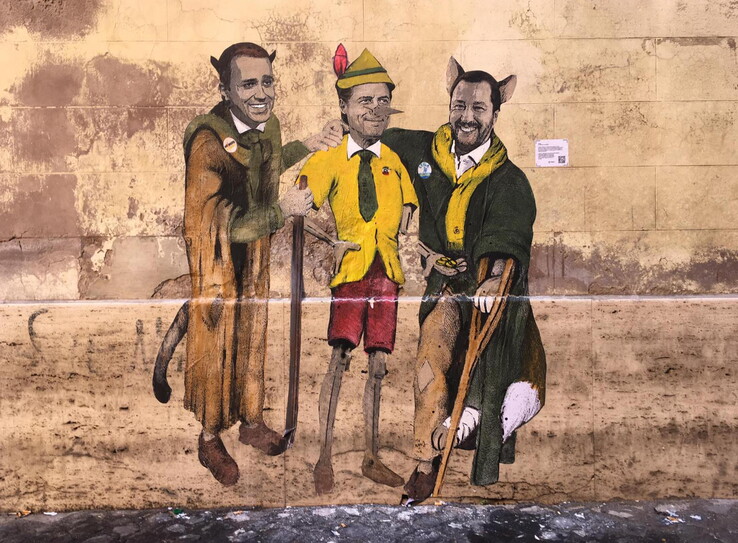 Si diede da fare, s’era ancora nel primo gabinetto giallo-verde, persino lo street artist Tvboy che realizzò nel centro di Roma, in vicolo della Torretta, un murale che effigiava Conte-Pinocchio tra il Gatto e la Volpe nelle sembianze dei vice premier Luigi Di Maio e Matteo Salvini (che a sua volta ha impersonato il burattino in altre circostanze).