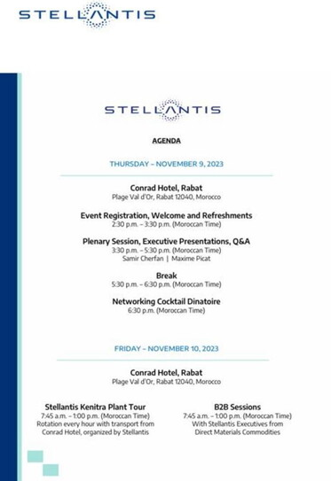 Durante il primo giorno gli invitati hanno potuto prima assistere alla presentazione delle attività di Stellantis in Marocco, poi partecipare a una cena cocktail di networking. Mentre il secondo giorno, per chi ha partecipato, era previsto un tour nell’impianto Stellantis di Kenitra (dove Peugeot produceva già dal 2015), con navette a ogni ora tra le 7.45 del mattino e l’una del pomeriggio, e, nella stessa fascia oraria, incontri business to business tra fornitori e i dirigenti di Stellantis che si occupano dell’acquisto di materie prime e semilavorati.