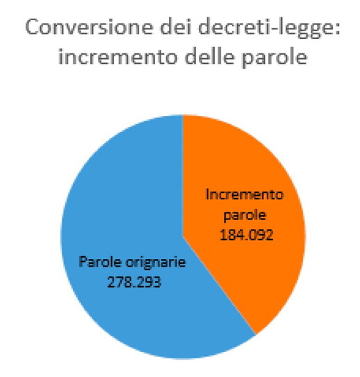Leggi di conversione più  decreti legge comprendono, negli ultimi 15 mesi, il 63,1 per cento della legislazione, e quindi la gran parte dell’attività legislativa (quantificata in parole) ruota intorno all’iniziativa governativa delle norme. Durante la 18ª legislatura rappresentava una cifra più alta, il 66,3 per cento.
