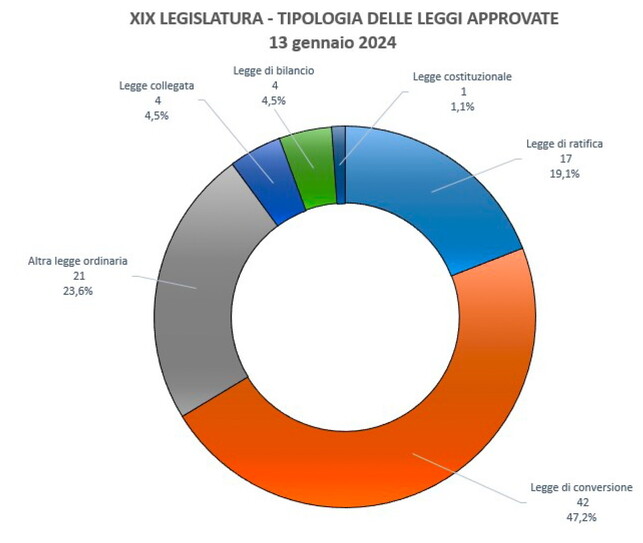 Il Servizio studi della Camera dei deputati pubblica da qualche anno un rapporto intitolato “La produzione normativa: cifre e caratteristiche”. L’ultimo, del 13 gennaio 2024, contiene un bilancio di 15 mesi, che vanno dal 13 ottobre 2022 al 13 gennaio 2024. Su questa base sono fondate le osservazioni che seguono. Le figure che seguono sono anche esse tratte da questo rapporto.