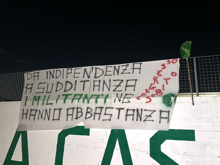 "Da indipendenza a sudditanza, i militanti ne hanno abbastanza". Recita così uno striscione di protesta comparso nella notte a Pontida, sopra la scritta "Padroni a casa nostra", vicino allo storico pratone dove ogni anno la Lega, sin dai tempi di Umberto Bossi, tiene la sua convention. Un manifesto in cui si chiede un "congresso subito", riferimento alla Lombardia, dove il congresso del partito locale è stato congelato. Si tratta di un'ulteriore manifestazione di malcontento dei militanti del Carroccio, che hanno anche diffuso un comunicato per spiegare il loro gesto: "Siamo un gruppo numeroso di persone iscritte alla Lega, militanti stanchi di essere vessati. L’azione che abbiamo portato avanti a Pontida vuole risvegliare le coscienze dei militanti leghisti, andremo avanti con molte altre azioni analoghe e sappiamo che ormai siamo la maggioranza a urlare che così questa Lega non va bene!. Il nostro partito non può più andare avanti così: manca una strategia e mancano delle proposte vere ma soprattutto un ideale.", si legge in un testo diffuso dall'ex deputato Paolo Grimoldi, uno degli animatori del Comitato nord che insieme a Bossi avrebbe voluto un ritorno alle origini federaliste della Lega.