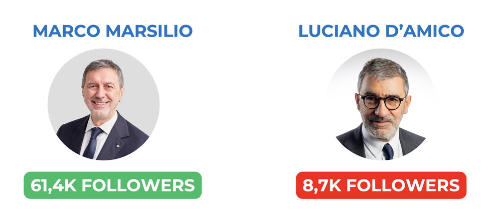 Relativamente ai canali proprietari dei due candidati, è emerso come Marsilio abbia una fanbase social molto più solida (64 mila followers) rispetto a quella di D’Amico (8,7 mila). Un fattore che, con molta probabilità, ha portato il candidato del centrosinistra a pubblicare con maggiore frequenza (2 post al giorno di media contro gli 1,3 post al giorno di Marsilio). In totale i canali social di D’Amico sono riusciti a produrre 63 mila interazioni contro le 46,7 mila di Marsilio, ma va comunque considerato il dato relativo alla frequenza di pubblicazione che, in proporzione, vede il governatore uscente in leggero vantaggio. I due hanno utilizzato argomentazioni diverse e cercato di mobilitare l’elettorato di riferimento con strategie opposte: se Marsilio ha puntato su “sviluppo”, “rapporto con il governo nazionale” e “continuità”, D’Amico ha invece deciso di fare leva sui problemi economici della Regione, cercando di mostrare i propri progetti per la crescita e il territorio. Il risultato è che i post di Marsilio con più engagement sono stati proprio quelli contenenti video e foto con Giorgia Meloni, mentre D’Amico è riuscito a mobilitare i followers con appelli al voto sul cambiamento. I dati relativi a mentions, engagement e sentiment su web e social disegnano uno scenario simile. Marsilio è più citato dell’avversario (6,56 mila mentions contro 4,29 mila), mentre su sentiment ed engagement c’è di base una leggera differenza a favore di D’Amico, avvantaggiato dal minor numero di menzioni che lo accostano ai leader nazionali.
