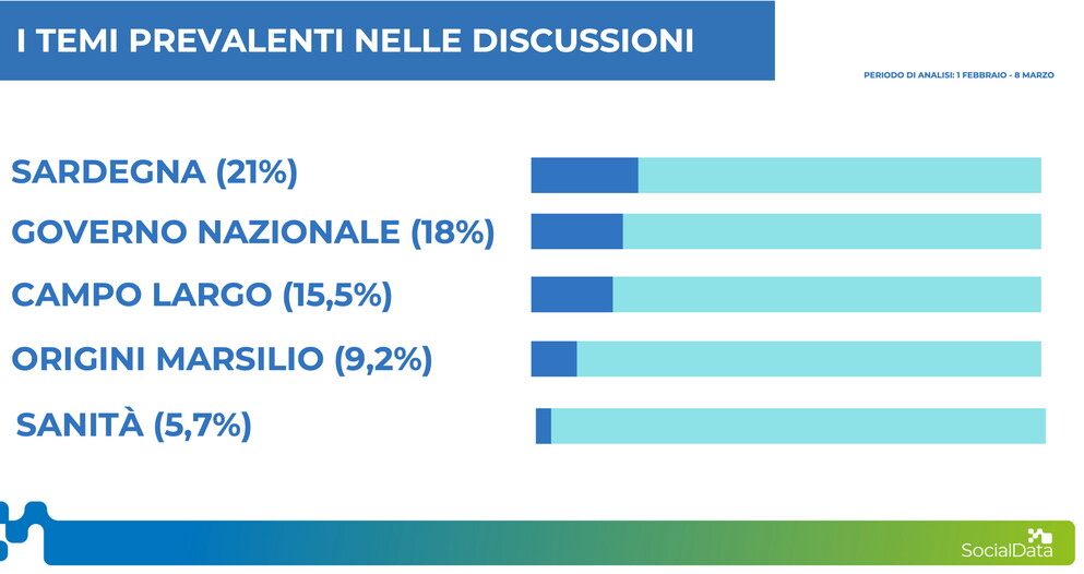 Un'analisi di SocialData per il Foglio fotografa le interazioni delle coalizioni e dei candidati alla presidenza della regione. Nel dibattito prevalgono i temi nazionali: dal campo largo alle elezioni in Sardegna. E il centrodestra incassa risultati leggermente migliori