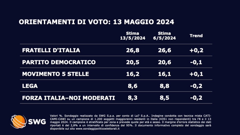 Fratelli d'Italia cresce, il Pd cala. A meno di un mese dal voto per le prossime elezioni europee, e a poco più di una settimana dall'atteso confronto televisivo tra la presidente del Consiglio Giorgia Meloni e la segretaria dem Elly Schlein, l'istituto di statistica Swg per il Tg La7 fotografa le intenzioni di voto degli italiani. Fratelli d'Italia si conferma ampiamente primo partito, guadagnando lo 0,2 per cento nell'ultima settimana e arrivando al 26,8 per cento. FdI è l'unica forza della maggioranza a crescere: sia per la Lega che per Forza Italia negli ultimi sette giorni si registra un -0,2 per cento: il partito di Matteo Salvini arriva all'8,6 per cento, mentre gli azzurri si fermano al 8,3.