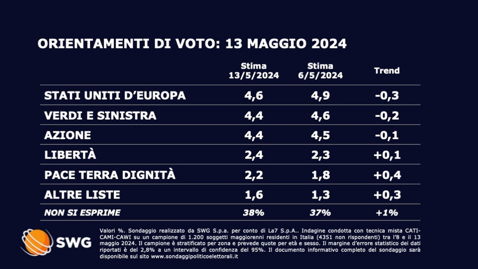Il secondo partito in Italia resta il Pd, che nell'ultima settimana però registra un calo: -0,1 per cento. I dem sono comunque dati sopa al 20 per cento di mezzo punto percentuale. La seconda forza politica d'opposizione, invece, si conferma essere il Movimento 5 Stelle che guadagna un +0,1 per cento attestandosi al 16,2. Il resto dei partiti d'opposizione calano: la lista degli Stati Uniti d'Europa (Italia Viva e +Europa) segna -0,3 per cento (4,6), l'Alleanza Verdi e Sinistra -0,2 (4,4), mentre Azione -0,1 (4,4). Swg ha registrato un balzo invece per Pace, Terra e Dignità, la lista di Michele Santoro: +0,4 per cento, che la fa arrivare al 2,2. Aumenta, infine, la percentuale di chi non si esprime: il partito degli astensionisti è il primo in Italia, con un +1 per cento, arrivando al 38 per cento.