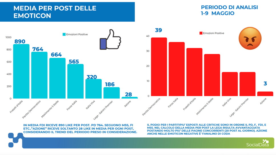 Ma quali sono le principali reaction degli utenti del web dinnanzi ai contenuti social pubblicati dai partiti? Fratelli d'Italia e il Partito Democratico sono i soggetti con più "like" sotto ciascun post: rispettivamente 890 e 764 per ogni contenuto. Dietro di loro, il M5s con 664. Mentre la Lega si ferma a 186 nonostante, lo ricordiamo, la pagina del Carroccio sia quella che posta con maggiore frequenza-