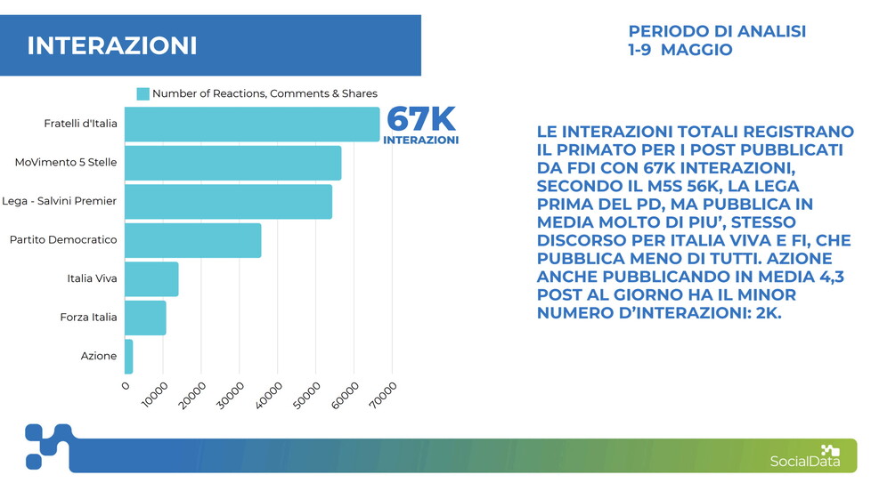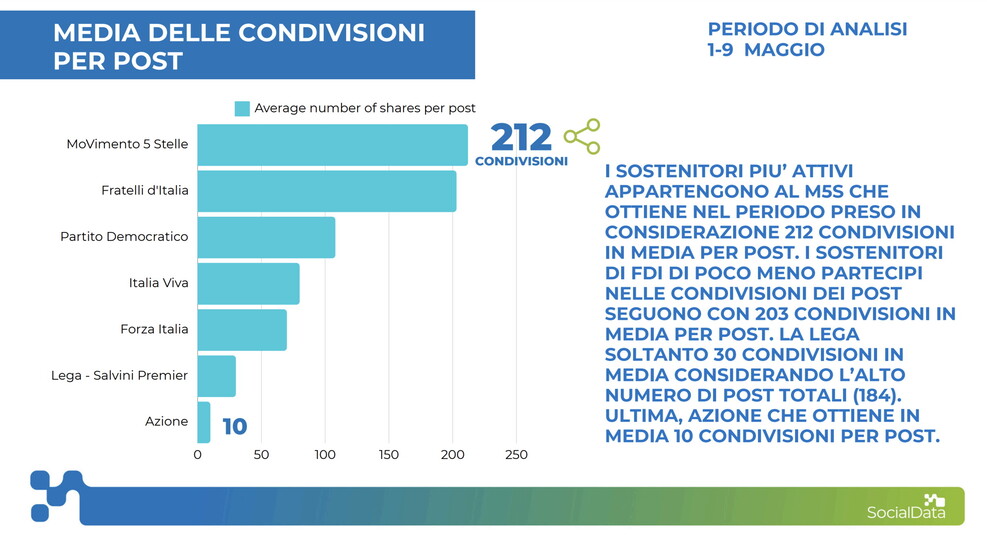Alla Lega spetta invece il primato di pagina più attiva, ovvero quella che posta più contenuti giornalieri: nel periodo 1-9 maggio sono stati in totale 184 (un numero superiore alla somma dei post pubblicati da tutti gli altri partiti nello stesso intervallo di tempo). Le condivisioni per ogni pubblicazione tuttavia arrivano in media a 30.