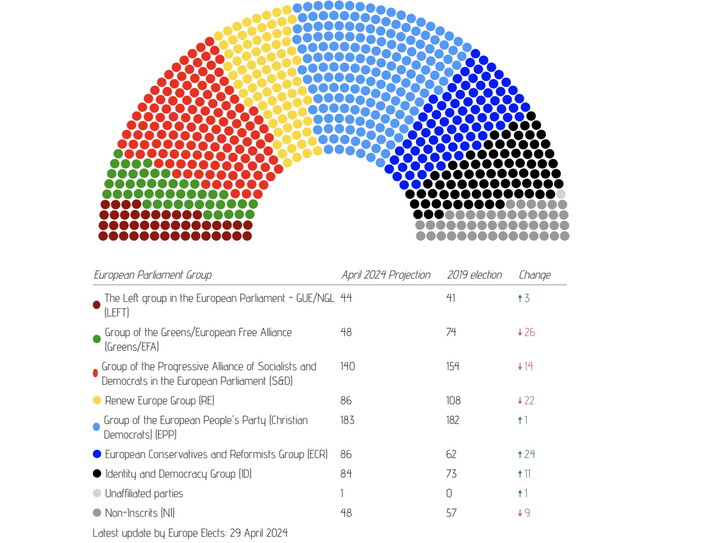 I sondaggi di Europe Elections in vista delle prossime elezioni di giugno prospettano una possibile vittoria del Ppe e di tutte le forze di centrodestra. Perdono seggi, invece, Renew e i S&D