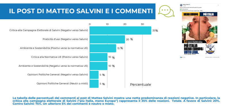 Nonostante i grandi numeri, però, la reazione delle persone non è stata del tutto positiva. Sempre secondo i dati dell'agenzia, i commenti al post di Salvini mostrano una predominanza di reazioni negative di circa il 70 per cento. Le critiche alla campagna elettorale del vicepremier e al suo slogan, rappresentano invece il 35 per cento dei commenti sotto al post. Solo il 20 per cento dei messaggi è invece positivo e un ulteriore 5 per cento "neutro". Social data però specifica che la grande viralità del post potrebbe aver innescato un meccanismo di "corsa alla critica" da parte di persone che abitualmente non commentano i post del leader del Carroccio. Motivo per cui non si può dire che gli elettori della Lega hanno abbandonato il loro leader, ma piuttosto che alla maggioranza dei potenziali elettori o degli indecisi questa strategia di comunicazione non è piaciuta.