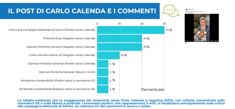 Social Data ha analizzato, per confronto, anche i commenti sotto al video di Calenda: poco più di un minuto nel quale il leader di Azione, con ironia pungente, ha "insegnato" a Salvini come bere. I commenti al post, spiega l'agenzia, restano comunque prevalentemente negativi: il 55 per cento dei messaggi lasciati dagli utenti è critica, al netto del sarcasmo, nei confronti delle politiche dell'Ue in materia di plastica. Il resto dei commenti è positivo nei confronti del leader di Azione (il 40 per cento) e contiene anche critiche alla campagna elettorale di Salvini.