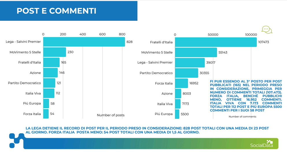 È stata calcolata poi la media delle emoticon negative per post in termini percentuali: Pd e Fi si attestano rispettivamente al 21,7 per cento e al 19,8 per cento, subito dietro Fdi al 18 per cento e M5S al 16 per cento.