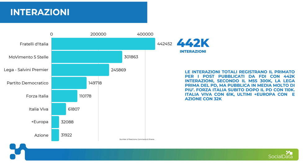 Fratelli d'Italia è il partito che durante la campagna elettorale ha coinvolto in maniera più attiva i propri follower sui social, aumentando il proprio bacino di sostenitori. È quanto emerge da un’analisi di SocialData, effettuata in esclusiva per Il Foglio, che ha preso in esame i dati relativi alle pagine Facebook dei principali partiti italiani (Fdi, Pd, M5S, Lega, Fi, Italia Viva, +Europa, Azione).