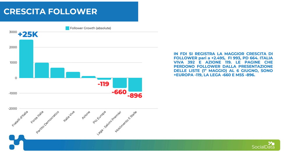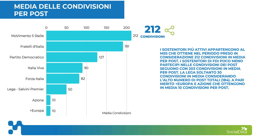 I sostenitori più attivi sono stati quelli del M5S, che ha ottenuto nel periodo preso in considerazione 212 condivisioni in media per post. I sostenitori di Fdi si sono fermati a 203 condivisioni in media per post, mentre la Lega a 30. Relativamente alla platea di utenti Facebook FdI ha beneficiato molto della campagna elettorale: 25 mila i followers guadagnati. Un trend contrario a quello registrato da Lega (-660 followers) e M5S (- 896 followers).