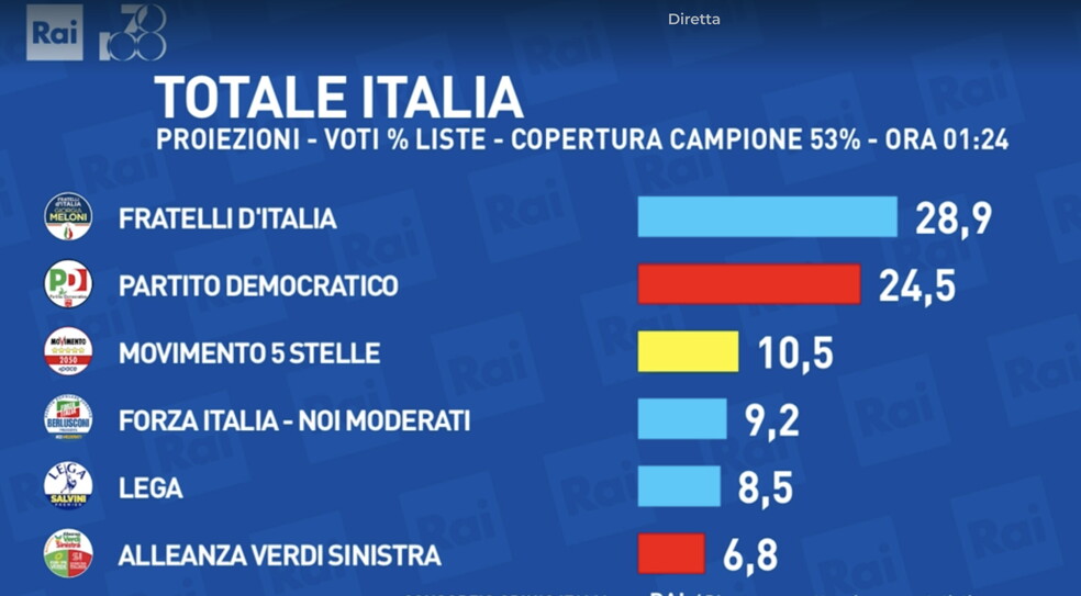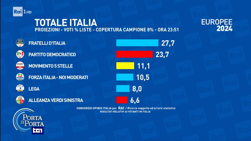 Fdi 27,7, Pd 23,7, M5s 11.1, Forza Italia 10.5, Lega 8, Stati Uniti Europa 4, Avs 6,6, Azione 3, Pace terra 2.5. Sono questi i risultati della prima proiezione Opinio Rai, realizzati con una copertura del campione dell'8 per cento.