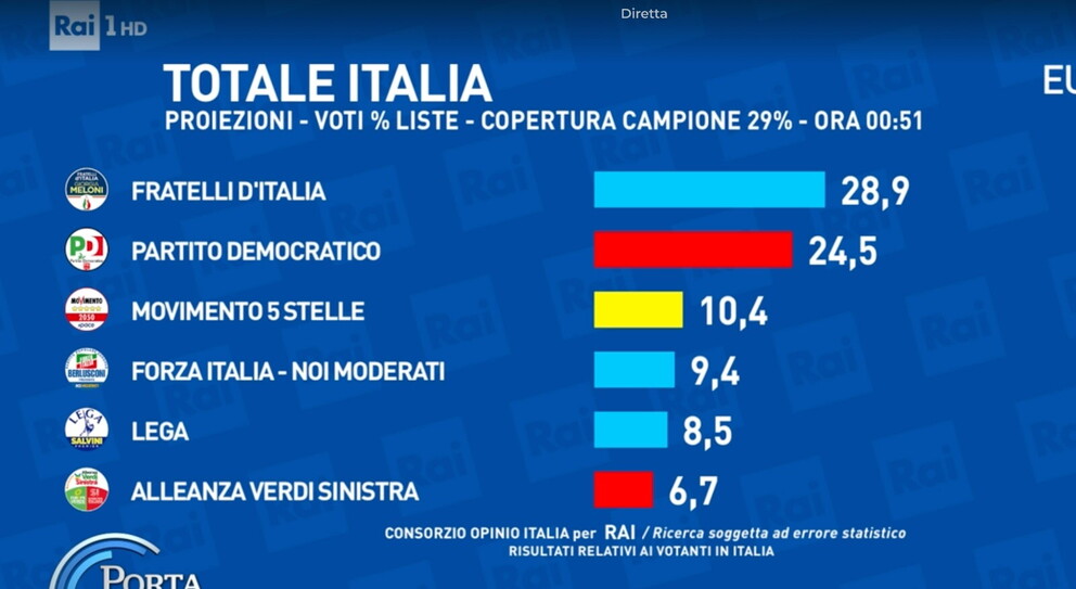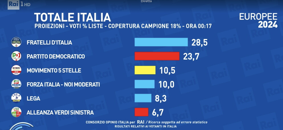 FdI 28,5, Pd 23,7, M5s 10.5, Lega 8, Forza italia 10. Avs 6.7, Stati Uniti d'Europa 4, Azione 3,4. Sono questi i risultati della seconda proiezione Opinio Rai, realizzati con una copertura del campione del 18 per cento.