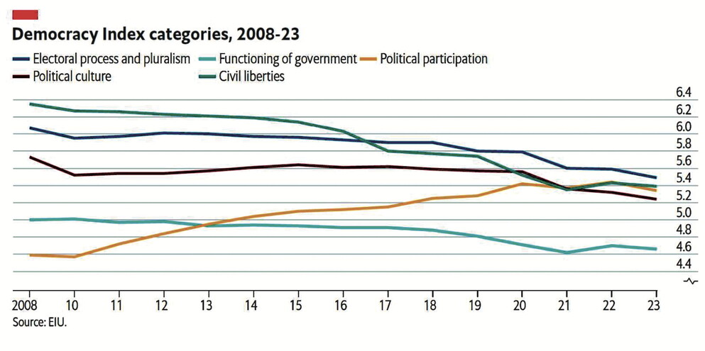 Se si considerano, però, solo le democrazie complete e si esaminano gli andamenti nel tempo, il quadro muta. Nel 2023 solo 24 paesi, la cui popolazione costituisce il 7,8 per cento della popolazione mondiale complessiva, avevano governi interamente democratici e inoltre, dal 2008 al 2023 si registra una tendenza della democrazia verso la stagnazione e la regressione. Le zone del mondo che vanno peggio sono l’Asia e l’Africa del nord.
