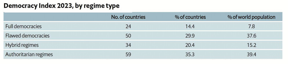 Ora, i dati aggregati sembrano indurre ad ottimismo perché nel 2023 ben 108 paesi, che raccolgono il 60,6 per cento della popolazione mondiale, erano governati da regimi o interamente o parzialmente democratici, o da democrazie ibride. Quindi, 59 paesi, che raccolgono il 39 per cento della popolazione mondiale, sono governati da regimi autoritari.