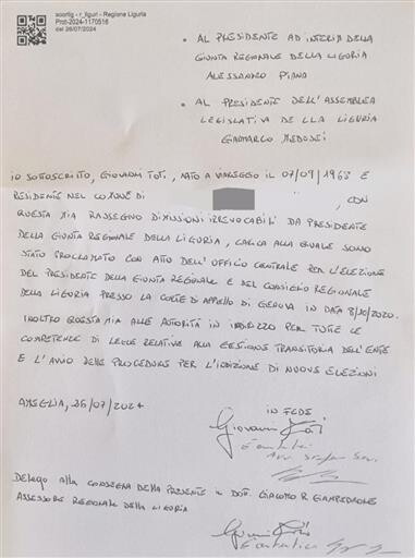 "Dopo tre mesi dall'inizio dei miei arresti domiciliari e la conseguente sospensione dall'incarico che gli elettori mi hanno affidato per ben due volte, ho deciso sia giunto il momento di rassegnare le mie irrevocabili dimissioni da Presidente della Giunta Regionale della Liguria", scrive Toti nella lettera. "Mi assumo tutta la responsabilità di richiamare alle urne, anticipatamente, nei prossimi tre mesi, gli elettori del nostro territorio, che dovranno decidere per il proprio futuro. Fino ad oggi il Presidente ad interim Alessandro Piana, la giunta, la maggioranza tutta, che ringrazio di cuore, si sono assunti l'impegno di evitare il blocco dell'Ente, rispettando tutti gli impegni presi e portando avanti progetti e cantieri, con senso di responsabilità, capacità, onore. Lo hanno fatto anche di fronte a un'opposizione che, lontana dall'attitudine istituzionale richiesta dal momento, ha saputo solo cavalcare la complessa situazione, dimentica dei suoi stessi valori del passato, di ogni civiltà giuridica, della Costituzione e di quella cultura di governo che dovrebbe rappresentare chi si candida alla guida di una comunità", ha aggiunto.