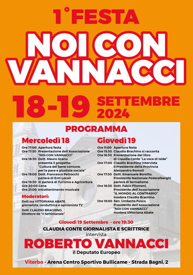 Gli occhi sono puntati soprattutto sulla seconda giornata, che si concluderà con l'intervista serale di Vannacci (a opera della giornalista Claudia Conte). Sono previsti gli interventi di Alessandro Romoli, presidente della provincia di Viterbo. Di Emanuele Boretto, presidente nazionale Federalberghi. Di Fabio Filomeni, presidente dell'associazione "Il Mondo al contrario". E dello stesso Fusco, che è presidente dell'assocazione "Noi con Vannacci".