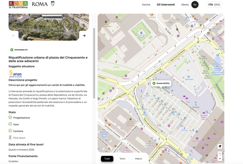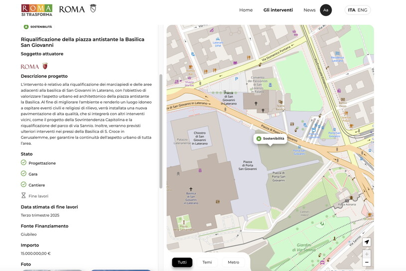 A piazza San Giovanni  i lavori sono cominciati ad aprile e si sono interrotti a causa di alcuni ritrovamenti archeologici a luglio. Anche in questo caso c’è una discrasia tra quanto riportato sul sito romasitrasforma.it e quanto invece riferito da Gualtieri . Sul sito si indica come data di fine lavori il “terzo trimestre 2025”. A Giubileo iniziato da oltre nove mesi. A Palazzo Chigi invece il sindaco ha garantito che sarà tutto pronto entro dicembre 2024. Lo stato di avanzamento dei lavori è fermo oggi al 15 per cento.  Una cosa è certa, a dicembre il cantiere dovrà essere rimosso. Piazza San Giovanni non è un luogo secondario del Giubileo.  Con San Pietro, San Paolo e Santa Maria Maggiore è una delle quattro basiliche papali provviste di porta santa. Il cuore del Giubileo. Uno dei quattro luoghi che verranno certamente visitati dai pellegrini.  Insomma da queste parti non si può lasciare un cantiere aperto a Giubileo iniziato. Anche in questo caso il rischio è che se i lavori non saranno completati ci si troverà con un cantiere “romanella”. Chiuso alla bene e meglio entro il Giubileo per poi essere riaperto alla sua conclusione. O, in alternativa, a un progetto rivisto in scala minore.