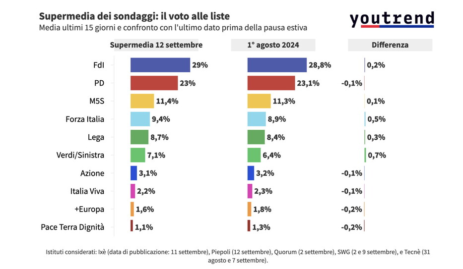 A poco più di un mese dalle elezioni regionali in Liguria, diversi partiti di maggioranza e opposizione registrano una crescita dei propri consensi. La Supermedia del 12 settembre curata da Youtrend e Agi è guidata da Fratelli d'Italia, che nei sondaggi guadagna lo 0,2 per cento in più rispetto al primo agosto, attestandosi al 29%. Diversamente, il Partito Democratico mantiene saldamente la seconda posizione con il 23 per cento, nonostante abbia perso in un mese lo 0,1 per cento delle preferenze. Poco sotto, tutte le forze centriste registrano cali della stessa entità mantenendo sostanzialmente invariato il loro posizionamento in classifica. Azione e Italia Viva non condividono più lo stesso polo, ma entrambi perdono lo 0,1 per cento raggiungendo rispettivamente il 3,1 e 2,2 per cento di gradimento. Vanno peggio +Europa e Pace Terra Dignità, agli antipodi sui programmi politici ma simili nei sondaggi, in quanto con lo 0,2 per cento in meno da agosto non riescono a superare la soglia psicologica del 2%.