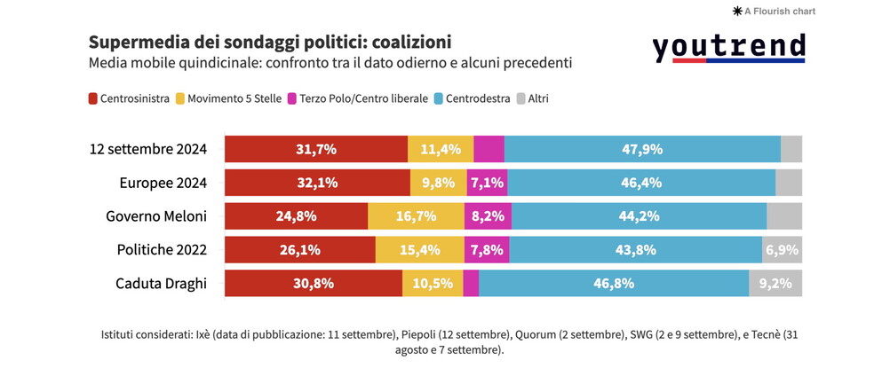 I due partiti della maggioranza di governo vedono crescere i loro consensi rispetto ad agosto, mentre l'alleanza tra Verdi e Sinistra Italiana riesce a ottenere l'incremento percentuale più importante dell'ultimo mese, consolidando il suo ruolo di peso all'interno dell'opposizione