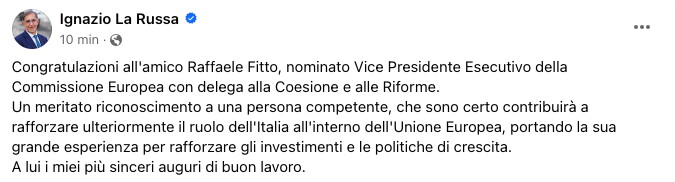 "Auguri a Raffaele Fitto per il suo nuovo, prestigiosissimo incarico. La vicepresidenza esecutiva della Commissione europea, con la delega alla Coesione e alle riforme, è un riconoscimento importantissimo per l'Italia ed è il risultato del lavoro e della credibilità internazionale della presidente Giorgia Meloni e del grandissimo valore del ministro Fitto", ha scritto il ministro della Difesa Guido Crosetto. "Oggi è un momento di orgoglio per ogni italiano che tifi Italia, indipendentemente dalle idee politiche. Raffaele rappresenterà la nostra nazione. Lo farà con la capacità, la serietà, la dedizione e l'impegno con cui ha sempre servito le istituzioni italiane. Gli auguro buon lavoro e so che ci mancherà la sua saggezza in Consiglio dei ministri", ha concluso nel post.