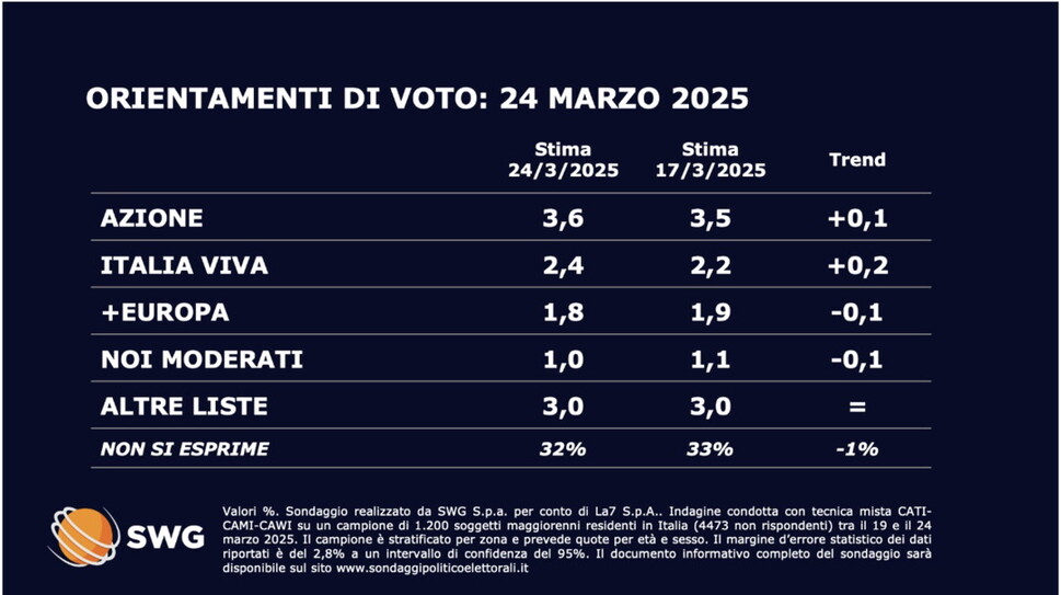 Mentre la terza forza, il Movimento cinque stelle, rimane stabile al 12,2 per cento. Anche Alleanza sinistra-verdi cala lievemente di uno 0,1 per cento, fermandosi al 6,2 per cento. Azione di Carlo Calenda è data al 3,6 per cento e Italia viva di Matteo Renzi al 2,4, in rescita rispettivamente di un più 0,1 per cento e un più 0,2 per cento.