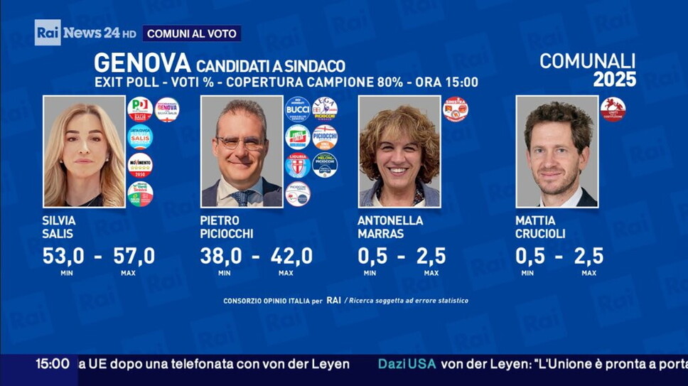 In base al secondo exit-poll Rai-Opinio, Silvia Salis – la candidata del campo largo, da Pd a Italia viva, passando per M5s – si posiziona davanti con il 51-55 per cento. Piciocchi invece è stimato al 38-42 per cento.