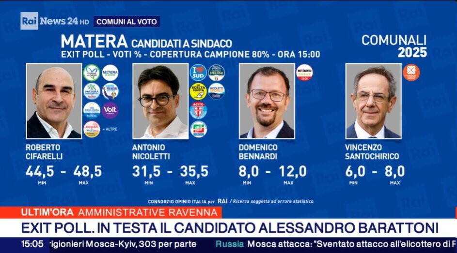 Con una copertura del campione del 52 per cento, a Matera è in testa con il 42,2 per cento Roberto Cifarelli, ex Pd, sostenuto da una coalizione civica trasversale in cui ci sono esponenti di Forza Italia, Azione, +Europa, seguito da Antonio Nicoletti, candidato del centrodestra, con il 38,3 per cento. Domenico Bennardi, già sindaco da ottobre 2020 a ottobre 2024, candidato per il M5S, è all'8 per cento e Vincenzo Santochirico, sostenuto dalla civica Progetto Comune Matera è al 7,4 per cento.