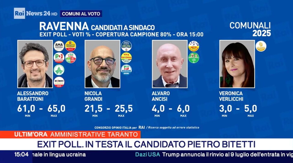 Alle elezioni comunali a Ravenna, con una copertura del campione del 59 per cento, è in testa con il 57,7 per cento Alessandro Barattoni, candidato del campo largo, seguito da Nicola Grandi (sostenuto da Fratelli d'Italia, Forza Italia e dalla lista civica 'Viva Ravenna'), con il 25,1 per cento. Alvaro Ancisi (sostenuto dalla Lega e dalla lista civica 'Ambiente e animali') è al 7,2 per cento e Veronica Verlicchi (lista civica 'La Pigna') è al 4 per cento.