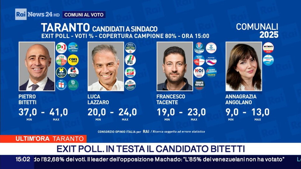 A Taranto il candidato sindaco di Pd, Avs e altre liste civiche, Piero Bitetti, è stimato fra il 37 e il 41 per cento dei voti. Luca Lazzaro, candidato sostenuto da Forza Italia, Fratelli d'Italia e Noi moderati, si fermerebbe invece fra il 20 e il 24 per cento. Francesco Tacente, candidato sostenuto da sei liste civiche fra cui una in cui sono confluiti i voti della Lega, avrebbe ottenuto fra il 19 e il 23 per cento. Fra il 9 e il 13 per cento per la candidata del Movimento cinque stelle, Annagrazia Angolano.