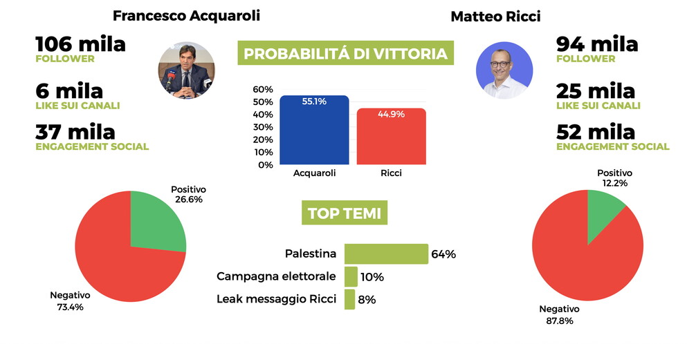 Nel periodo estivo, Acquaroli appariva favorito con il 53% delle interazioni contro il 47% di Ricci, penalizzato da una minore notorietà e dal peso mediatico dell’indagine giudiziaria che lo riguardava.