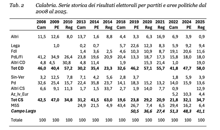 Un altro fenomeno ricorrente, legato a quello precedente, è "la crescita vistosa delle liste di orientamento moderato o centrista, a forte connotazione territoriale". Alle europee del 2019 le liste del centrodestra avevano ottenuto il 46 per cento dei voti e raccolsero il 57 per cento alle regionali dell'anno successivo. Simili sequenze sono state registrate anche tra il 2024 e il 2025 e il 2009 e il 2010. Questi dati mostrano che "molti elettori calabresi che domandano protezione sociale a partiti del centrosinistra e al Movimento 5 Stelle nelle elezioni parlamentari, tendano stabilmente a orientarsi, per la stessa ragione, verso candidati al consiglio regionale dell’area centrista, o meglio di candidati privi di una chiara connotazione ideologica, più presenti nel territorio". Per i 5 Stelle poi c'è da sottolineare che il calo dei voti è in parte anche dovuto "all’attrazione della lista 'Tridico Presidente'".