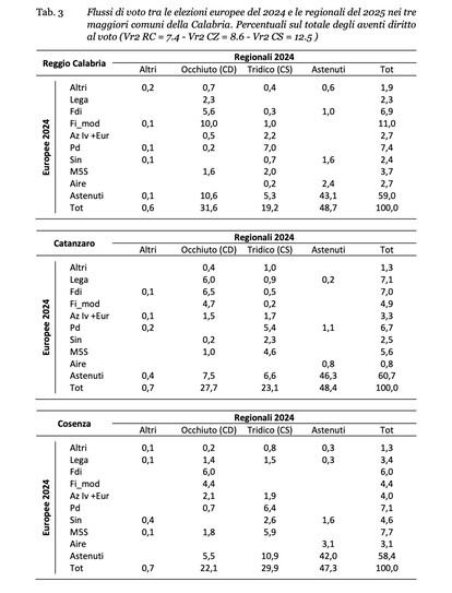L'Istituto Cattaneo ha poi analizzato i flussi stimati nei tre comuni maggiori, Reggio Calabria, Catanzaro e Cosenza, considerando il tasso di astensione "ufficiale". Le statistiche indicano che "con sufficiente chiarezza che in questo caso i maggiori flussi 'da sinistra a destra', nel complesso pari a non meno di cinque punti percentuali sui voti validi, vengano in parte dall’area 'liberal-democratica' (Azione, Italia Viva, +Europa) in parte da elettori che nel 2024 avevano votato per il M5s".