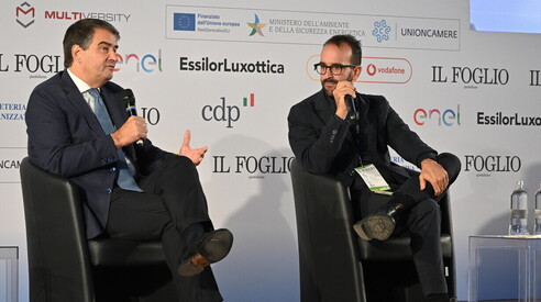 Il vicepresidente della Commissione europea Raffaele Fitto con il direttore del Foglio Claudio Cerasa alla Festa dell'Ottimismo (foto Ansa)