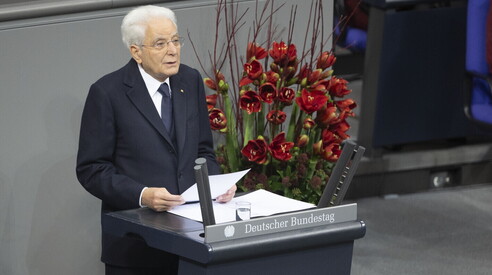Oggi rivolgiamo il nostro sguardo, il nostro pensiero, alle vittime di quelle tragedie. Dai militari caduti ai civili, vittime di quella condizione - la guerra - che la Legge Fondamentale tedesca e la Costituzione italiana ripudiano, facendo propria la grande lezione derivante dal tragico secondo conflitto mondiale. Ci uniamo, in una giornata di memoria e di lutto, perché ricordare la nostra storia comune è esercizio indispensabile nella nostra inesauribile aspirazione alla pace. Memoria delle atrocità dell’uomo nel passato e dolore profondo per quelle presenti ci obbligano a un esercizio di consapevolezza: la pace non è un traguardo definitivo, bensì il frutto di uno sforzo incessante, fondato sul raggiungimento di valori condivisi e sul riconoscimento della inviolabilità della dignità umana di ogni persona, ovunque.
