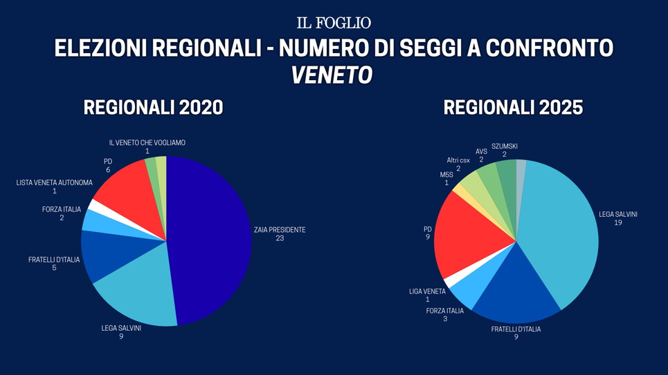 In Veneto ha vinto il leghista Alberto Stefani. I seggi da spartire nel centrodestra sono 33: domina la Lega che avrà a disposizione 19 seggi. Il dato però non tiene conto del fatto che questa volta la lista Zaia non c'è. Per intenderci: nel 2020 la lista “Zaia Presidente”, che correva separata da quella della Lega, arrivò a un milione di voti, prendendo 23 seggi. La Lega, in questa tornata elettorale, grazie a Zaia capolista in tutte le regioni e con 204.000 preferenze, ha raddoppiato i suoi voti e i suoi seggi. In ogni caso, Fratelli d'Italia non arriva neanche alla metà: si ferma a 9, anche se il dato è quasi raddoppiato rispetto alle scorse elezioni. Se invece al sud, come vedremo successivamente, la sorpresa si chiama Forza Italia, in Veneto i forzisti faticano e conquistano 3 seggi, comunque uno in più rispetto a 5 anni fa. Uno a testa invece per la Liga Veneta e l’Udc. A secco Noi Moderati, che alle scorse elezioni neanche esisteva. In generale, il centrodestra perde 600.000 voti.