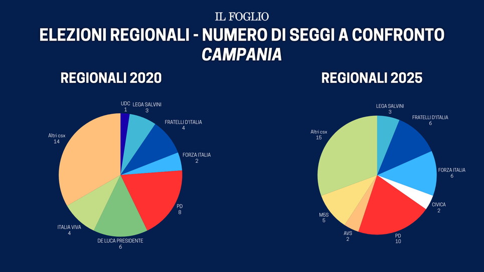 Spostandoci più a sud, in Campania, a vincere è il pentastellato Roberto Fico. Il centrosinistra conquista trentadue seggi, esattamente come cinque anni fa. Il Pd ne conquista 10 e doppia il M5S, che arriva a 5 riuscendo a star davanti alla lista del presidente uscente Vincenzo De Luca A testa alta, seppur con una differenza minima di qualche migliaio di voti. Nonostante ciò, De Luca porta a casa 4 seggi. Avanti Campania, Casa Riformista e la lista del nuovo governatore Fico si fermano a 3. Infine le liste di Avs e di Clemente Mastella, con 2 seggi a testa. Nelle elezioni del 2020, la presenza di molte liste (quindici) distribuì il voto nel centrosinistra, che vedeva comunque il Pd come primo partito, seguito dalla lista di Vincenzo De Luca. Guardando a cinque anni fa, in Campania è il centrosinistra a perdere voti: circa 500.000.
