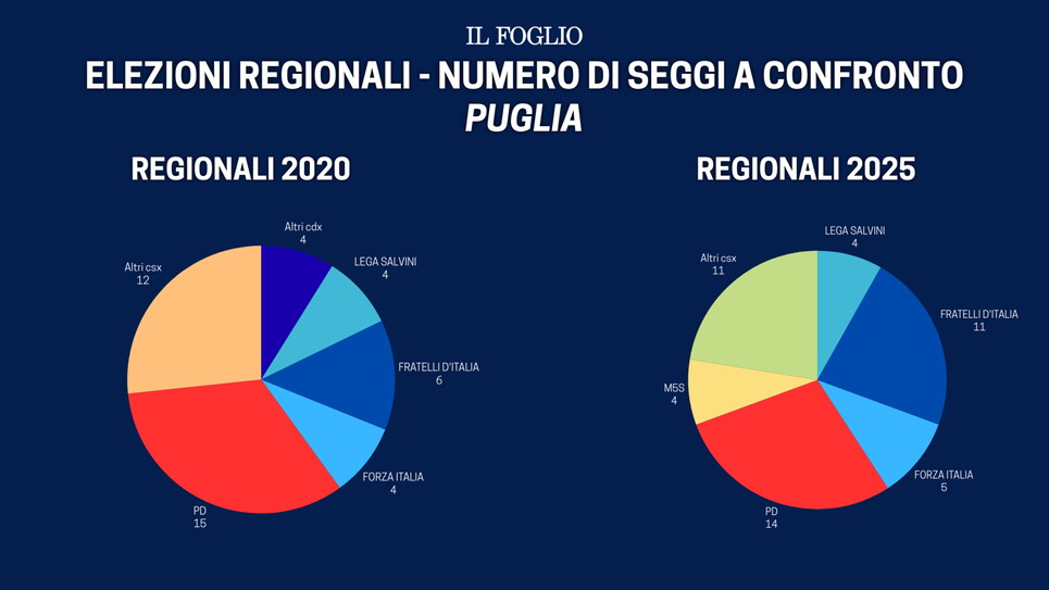 È stata forse la vittoria più scontata di queste elezioni quella di Antonio Decaro, che con la coalizione di centrosinistra ha portato a casa ben 29 seggi. Il dominio del Pd porta a casa 14 consiglieri regionali, segue la lista del candidato Decaro con 7. Quattro seggi a testa per M5S e Per la Puglia. Flop per Avs che non riesce a conquistarne neanche uno. Anche in Puglia, le liste della coalizione di centrosinistra di cinque anni fa a sostegno di Michele Emiliano erano quindici, ma solo in tre riuscirono a conquistare seggi: il Pd ne conquistò 15, mentre la lista del candidato Con Emiliano e i popolari ne presero sei, per un totale di ventisette, due in meno rispetto a oggi.