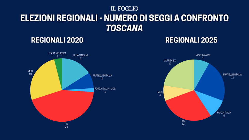 Le recenti elezioni del 12 e 13 ottobre in Toscana hanno visto la conferma di Eugenio Giani come presidente della Regione e il centrosinistra uscire con un bottino di 23 consiglieri regionali eletti, uno in meno rispetto alle passate elezioni. Quattordici seggi per il Pd, 4 per Casa Riformista, 3 per Avs e ultimo posto per il M5S con due seggi. Un voto distribuito tra più forze politiche rispetto a 5 anni fa, che vedeva 22 seggi al Pd e 2 alla lista di Italia Viva con +Europa. Circa 90.000 voti perduti ma equilibri rimasti pressoché invariati. L'unico elemento da considerare è il M5S, che nel 2020 decise di correre da solo acciuffando 13 seggi e il doppio dei voti rispetto a questa tornata elettorale dove ha prevalso una logica di coalizione.