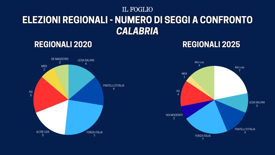 Il 5 e 6 ottobre Roberto Occhiuto ha vinto le elezioni regionali in Calabria, portando a casa 20 seggi, uno in più rispetto a cinque anni fa, con la coalizione di centrodestra al tempo guidata da Jole Santelli, morta a ottobre 2020. In questa tornata elettorale è cresciuta Forza Italia, prima forza della maggioranza in Calabria, oggi e 5 anni fa, conquistando 7 seggi. La lista di Occhiuto ne prende 4 come Fratelli d’Italia, che cresce in voti ma non in seggi, mentre la Lega perde un seggio e anche qualche migliaio di voti. Noi moderati si ferma a 2.