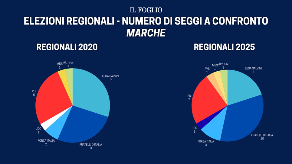 Le Marche sono la regione che a settembre ha aperto il cerchio delle elezioni regionali 2025, dove ha vinto il candidato del centrodestra Francesco Acquaroli. I seggi conquistati dal centrodestra sono 19 e anche qui c’è stato un rovesciamento degli equilibri. Se nel 2020 la Lega dominava la coalizione, quest'anno ha conquistato gli stessi seggi di Forza Italia: 3. Si conferma prima lista Fratelli d’Italia con 10 seggi, 1 a testa per le liste civiche a sostegno di Acquaroli. Nel centrosinistra è sempre il Partito democratico a farla da padrone con 6 consiglieri regionali su 11. Arriva a 2 la lista civica a sostegno del candidato dem Matteo Ricci, 1 a testa invece per M5S, Avs e Progetto Marche.
